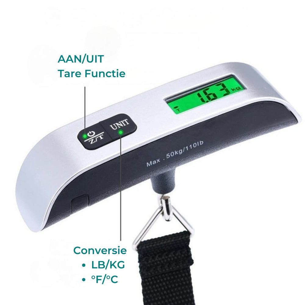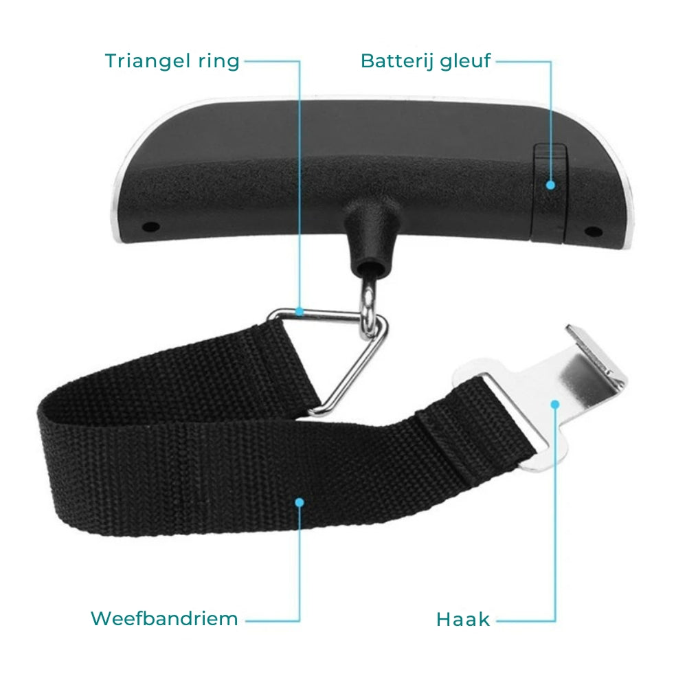 De ergonomische handgreep en robuuste riem zorgen ervoor dat je met één hand kunt wegen zonder wiebelen of scheef hangen. Alles voelt stevig, solide en betrouwbaar. Precies wat je nodig hebt vlak voor je vlucht.
